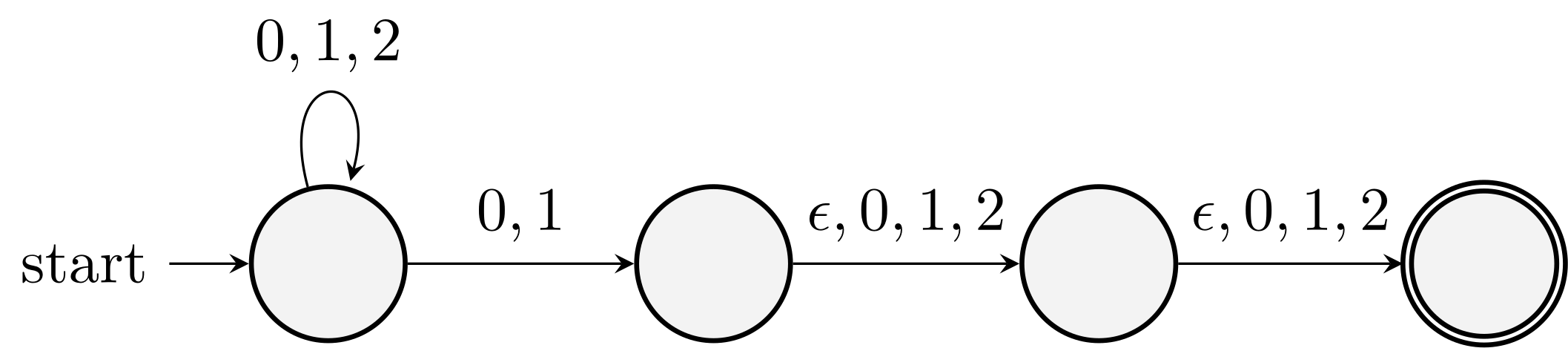 As \(q_{3}\) is an accepting state and we now remove tape symbols around \(q_{3}\) \[\begin{align*} A:\;& \#q_{1}01\#1q_{2}1\#10q_{1}\#1q_{2}01\#q_{3}101\#q_{3}01\#q_{3}1\#\\ B:\;& \#q_{1}01\#1q_{2}1\#10q_{1}\#1q_{2}01\#q_{3}101\#q_{3}01\#q_{3}1\#q_{3} \#. \end{align*}\]