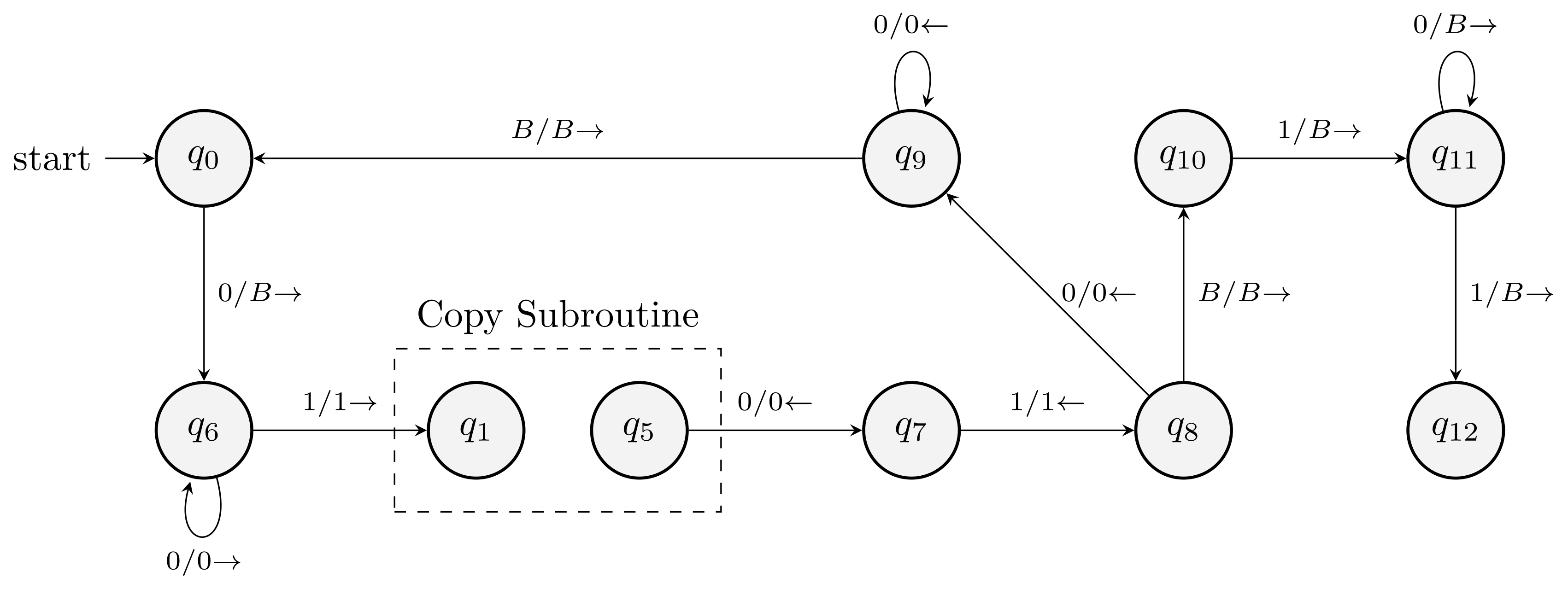 Without loss of generality, we assume \[\begin{equation*} M = (Q, \Sigma, \Gamma, \delta, q_0, B, F) \end{equation*}\] never prints the blank symbol and never moves to the left of the starting head position.
